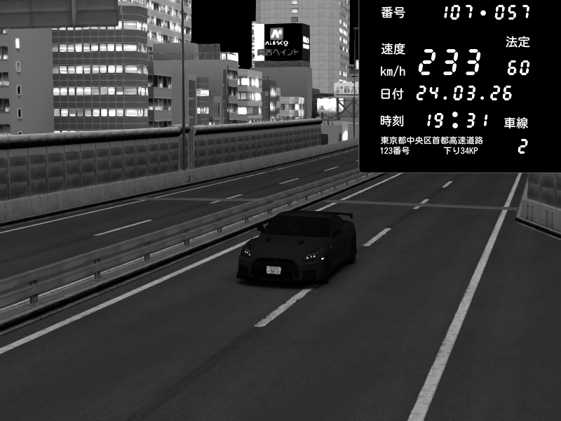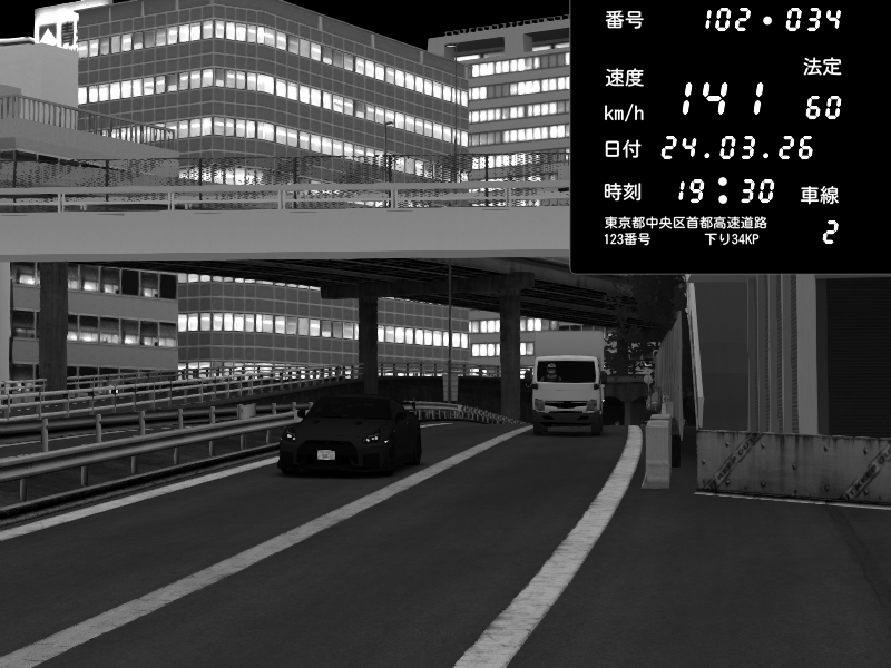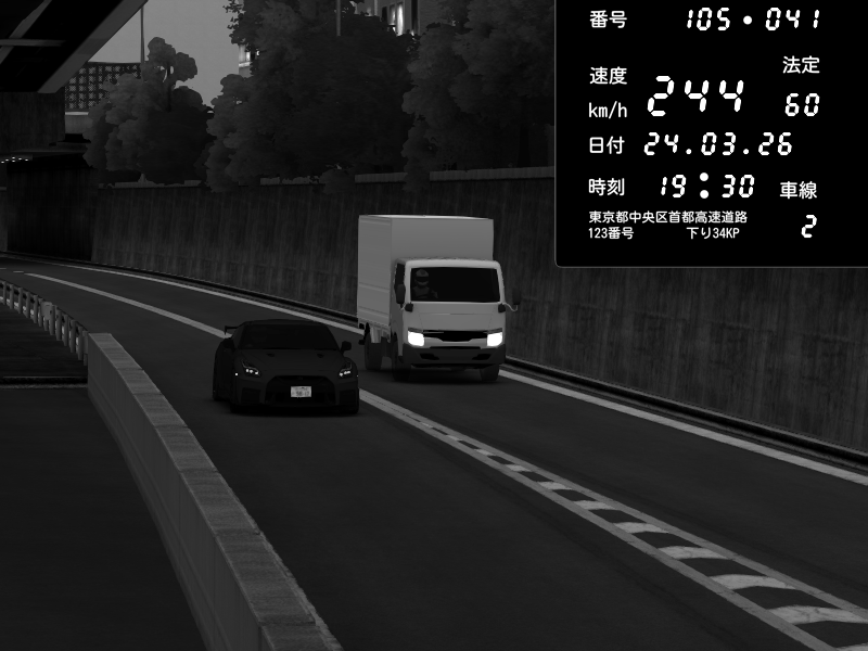 | 2026/03/24 19:30 | C1外回り 新富町 | 141 / 60 km/h | Player | Nissan GT-R NISMO 2017 | CAPTURE |