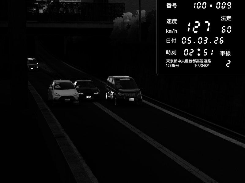 | 2026/03/05 02:53 | 9号下り 木場 | 225 / 60 km/h | Nissan Skyline GTR R33 (S3 - Wangan) | CAPTURE |