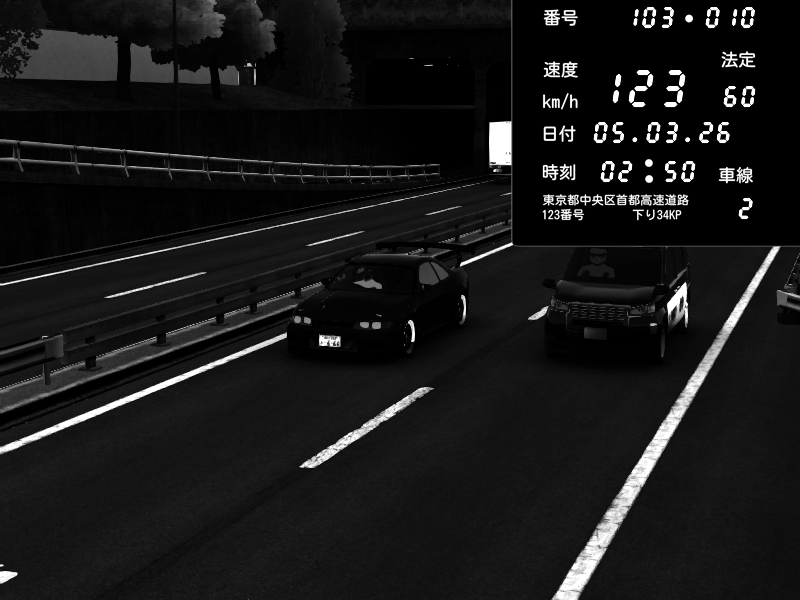 | 2026/03/05 02:50 | C1内回り 銀座 | 123 / 60 km/h | Nissan Skyline GTR R33 (S3 - Wangan) | CAPTURE |