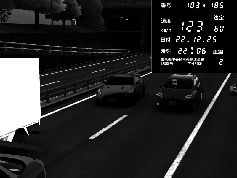 | 2025/12/22 22:06 | C1内回り 銀座 | 123 / 60 km/h | Nissan GT-R NISMO 2017 | CAPTURE |