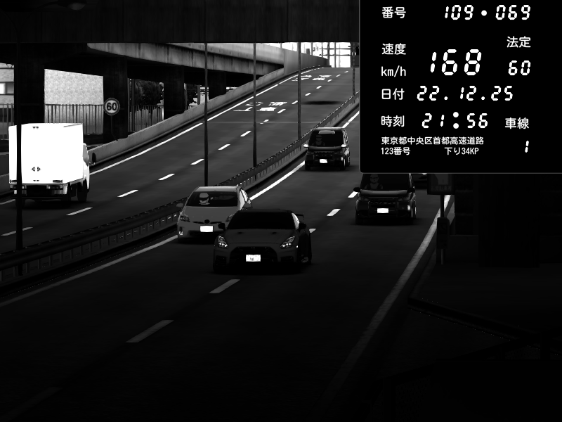 | 2025/12/22 22:08 | C1内回り 竹橋JCT | 190 / 60 km/h | Nissan GT-R NISMO 2017 | CAPTURE |